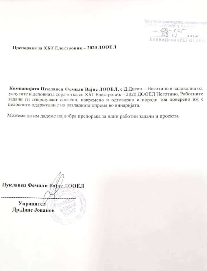 Компанијата „Пуклавец Фемили Вајнс ДООЕЛ“, Д. Дисан - Неготино е задоволна од услугите и деловната соработка со ХБТ ГРУП.